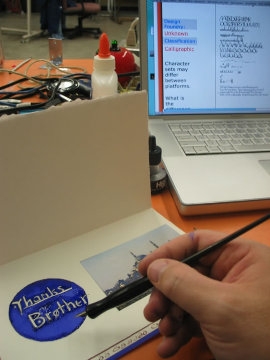 | I researched an Arab looking text and found it in an arab calligraphy website, this served as an important reference with lettering the card. I also decided to invert the writing to create a emphasis to the Thanks Brother text. I drew the circle with a template in pencil and then used the ink dropper to fill in the negative area and used the ink pen nib to outline the positive space leaving it blank or white in this case. I also created two stripes using tape and a brush with ink. Then filled in with the Ottoman calligraphy the words of "Thanks" in Turkish. This added variety and rhythm to the embellished edge that will be seen from the front of the card because of the textured edge of the card front. |